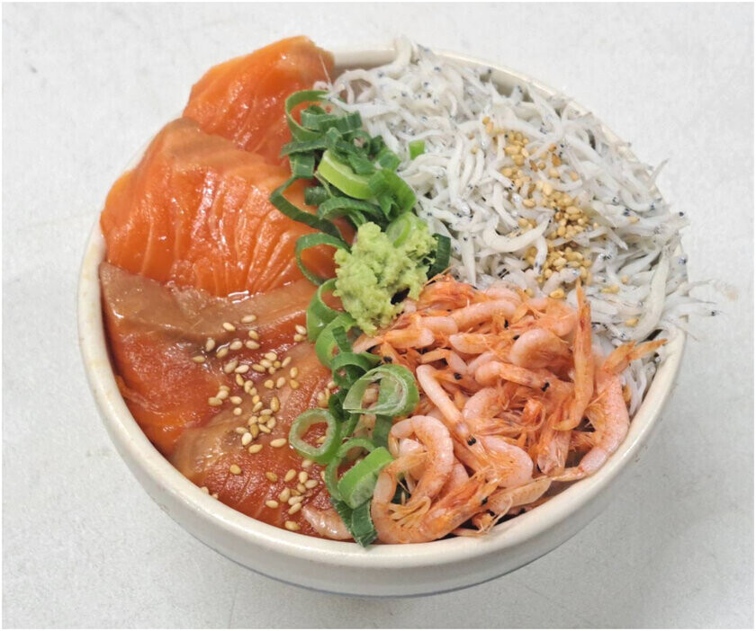 「富士山サーモン」と静岡県産の釜揚げしらす、釜揚げ桜えびを合わせた、静岡の味覚を思う存分味わえる丼です。