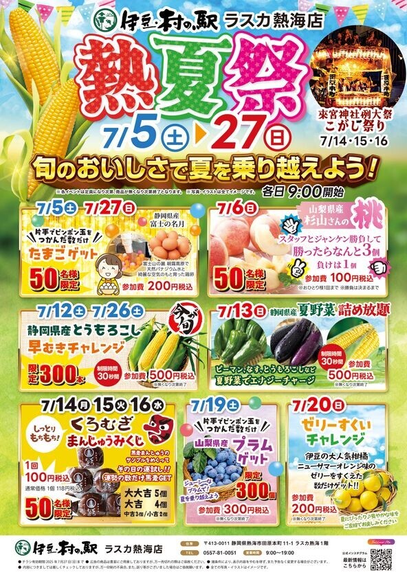 伊豆・村の駅 ラスカ熱海店(運営:株式会社村の駅、所在地:静岡県熱海市田原本町)では、6月に開催し大好評だったお野菜の詰め放題などの特別イベントを、7月も開催!2025年7月5日(土)~27日(日)に熱海が熱くなる夏イベント「熱夏祭」を、毎週土日と「来宮神社例大祭」が行われる2025年7月14日(月)~16日(水)に開催いたします。