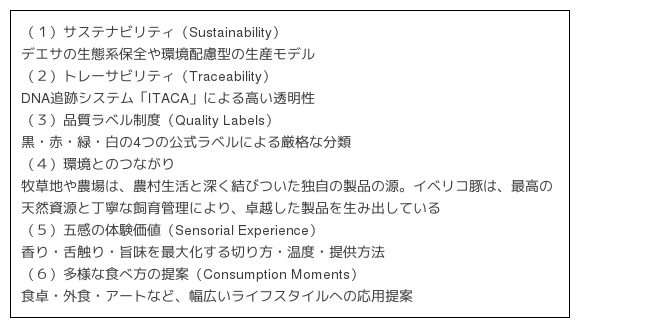 ASICIはイベリコハムが持つ文化的、食文化的価値を、以下の6つのテーマを世界基準として発信を続けている。