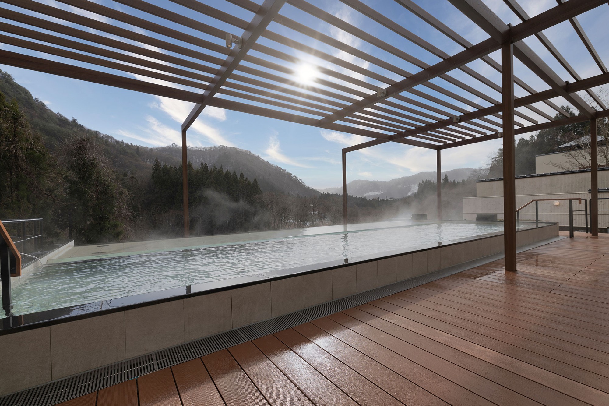 至福の温泉体験をご満喫いただくため、既存の露天風呂を拡張し「インフィニティ温泉」としてリノベーションいたしました。湯に浸かると視界に広がるのは壮大な渓谷の風景。崖からせり出すように造られた湯船は、まるで渓谷の上に浮かんでいるかのような浮遊感を味わえます。