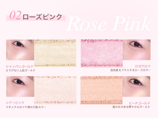 温かみのある優しい輝きで、自然な血色感とツヤ感を演出。シャンパンゴールドは顔全体の立体感を、ピーチゴールドは頬にのせるだけで「内側から輝いてる?」と錯覚するほどの自然な発光感と血色感を生み出します。