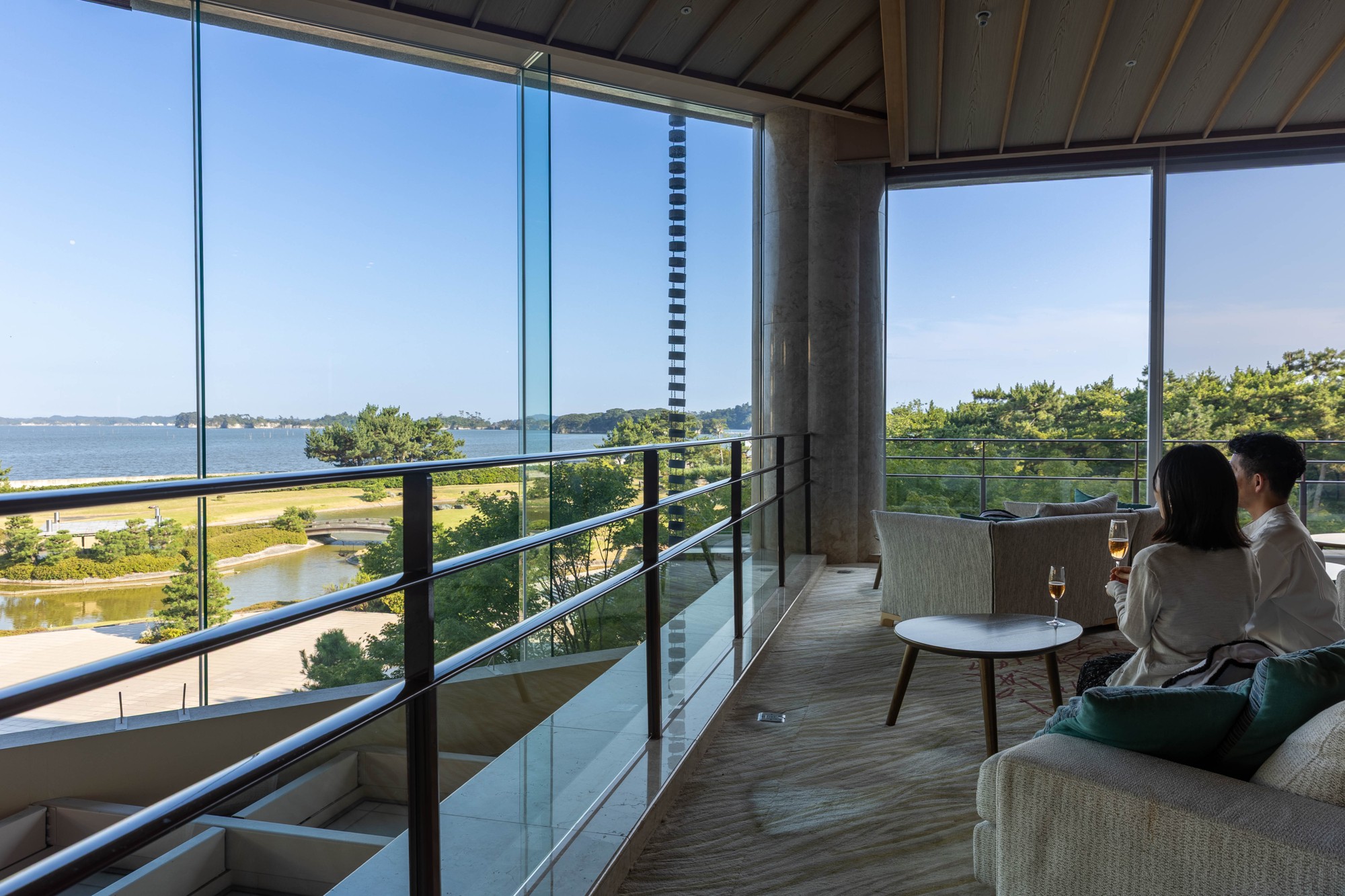 日本三景・松島の絶景を全客室から望む、静かな海辺の温泉リゾート。チェックアウトまでお財布を気にせず、ラウンジでの飲食やアクティビティ、館内の「藤田喬平ガラス美術館」入館までを無料で愉しめる「オールインクルーシブ」のステイスタイルが特徴です。7,000坪の水上庭園や、料理人が目の前で仕上げるオーダービュッフェ、生演奏が流れるラウンジなど、日常の喧騒を離れた「理想の日常」を提供しています。