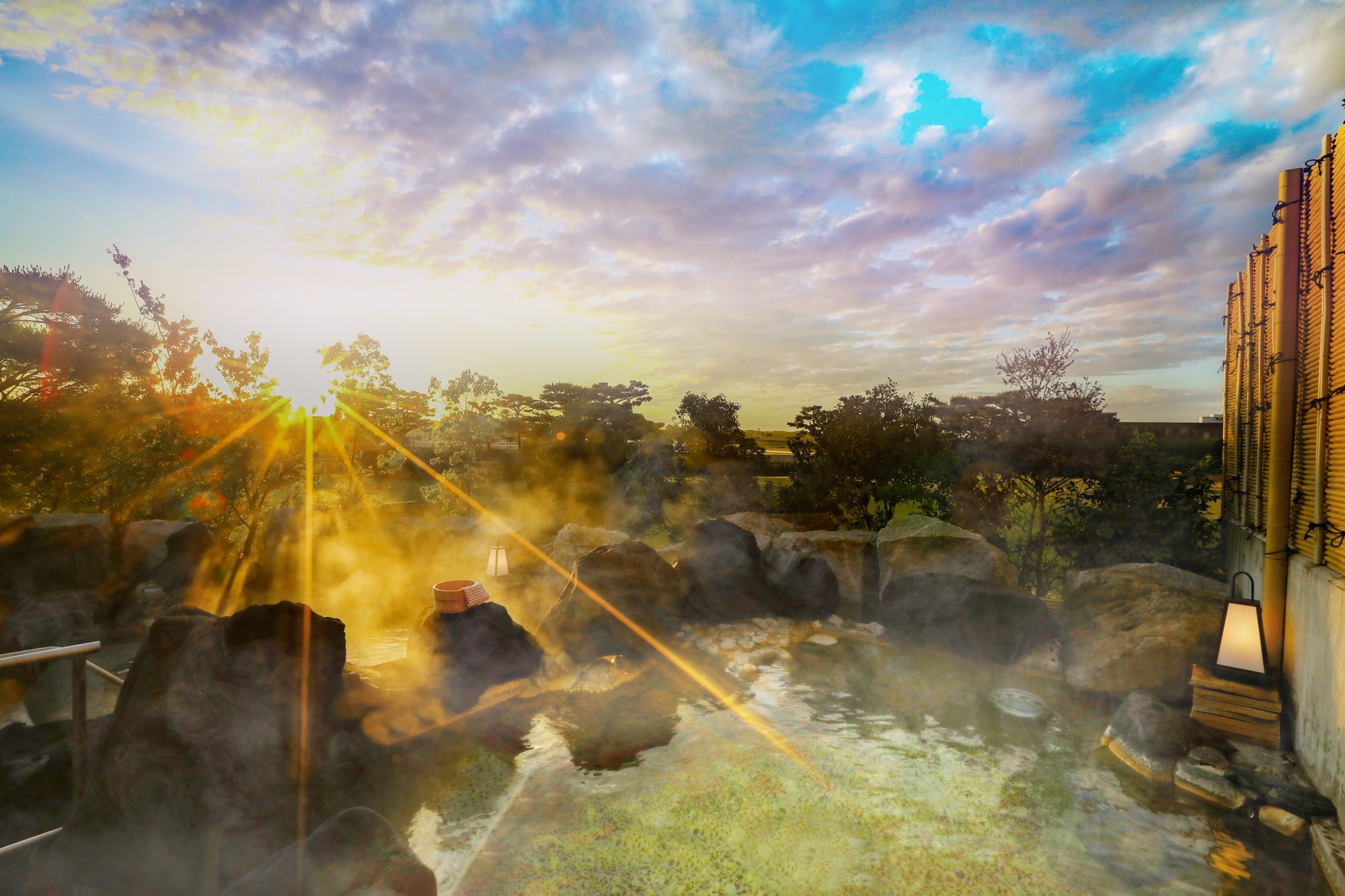 自慢のお風呂は、地下1,500メートルから湧き出る松島温泉をご堪能いただけます。屋根のない開放的な露天風呂からは、日中は青空、夜は満点の星を眺める風情ある湯あみを。塩化物泉に加え、保湿効果が期待できる硫酸塩泉で、心ゆくまでおくつろぎください。