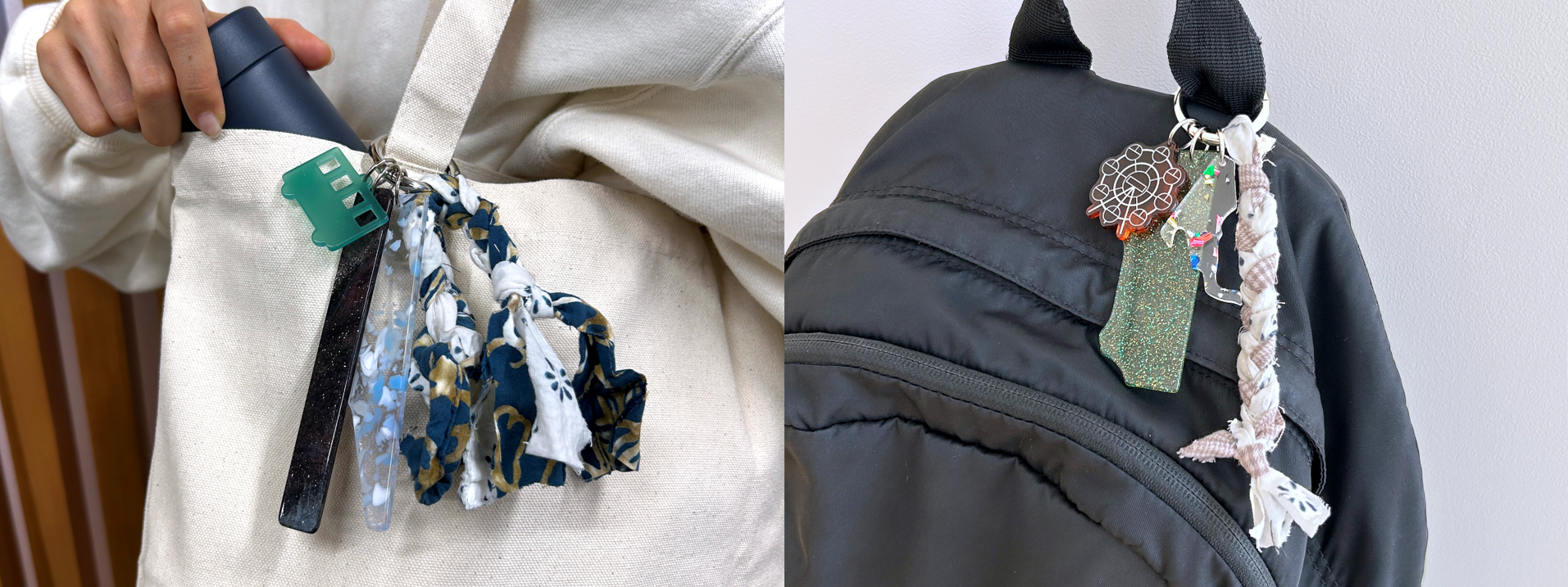 2025年の夏と冬に京阪シティモール・京阪モールで繊維製品回収BOXを設置していた京都女子大学の有志によるものづくり集団「KUMO」に依頼し、BOX設置時に回収された古着や古布をアップサイクルしたパーツを制作。生地を裂いて編む“裂き編み”という手法を用いて制作したパーツは1つお選びいただけます。