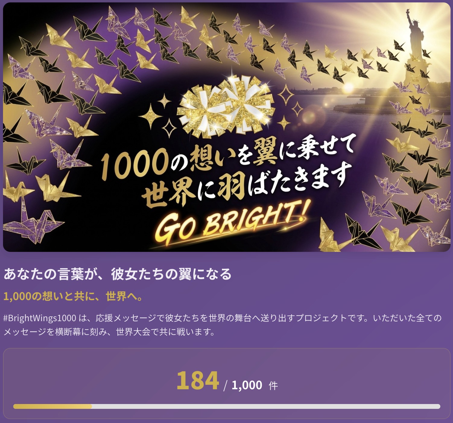 公式サイトでは、応援メッセージ企画「Bright Wings」を展開中。千羽鶴のように「1,000人の想い」を集め、全てのメッセージを横断幕に刻んで世界大会の会場へ届けます。