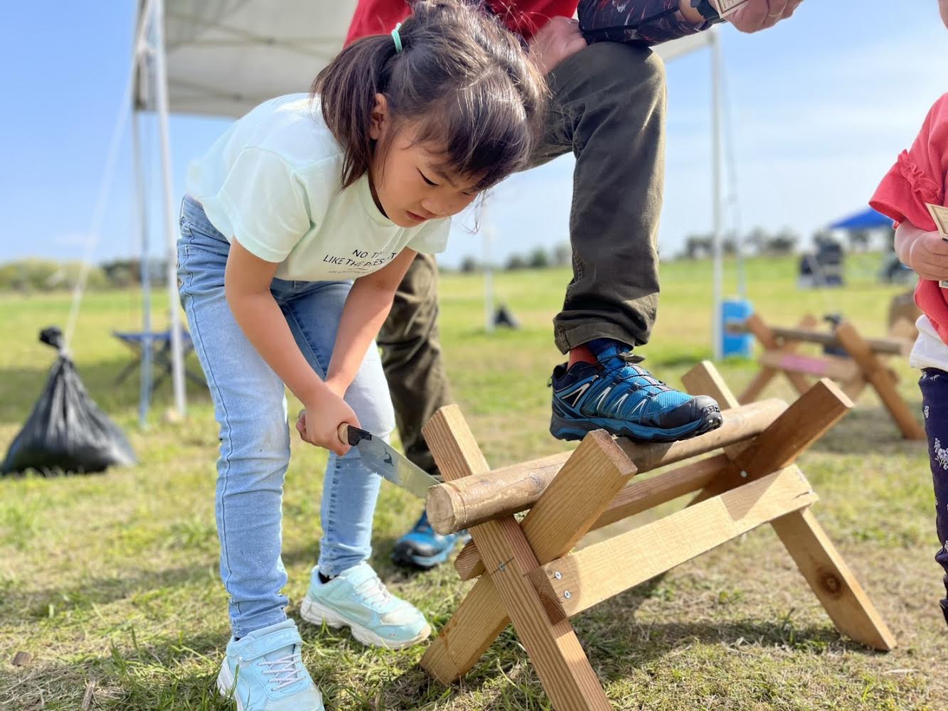 火おこしや丸太切りなどのアウトドア体験に加え、お子様向けの発掘体験も行います。