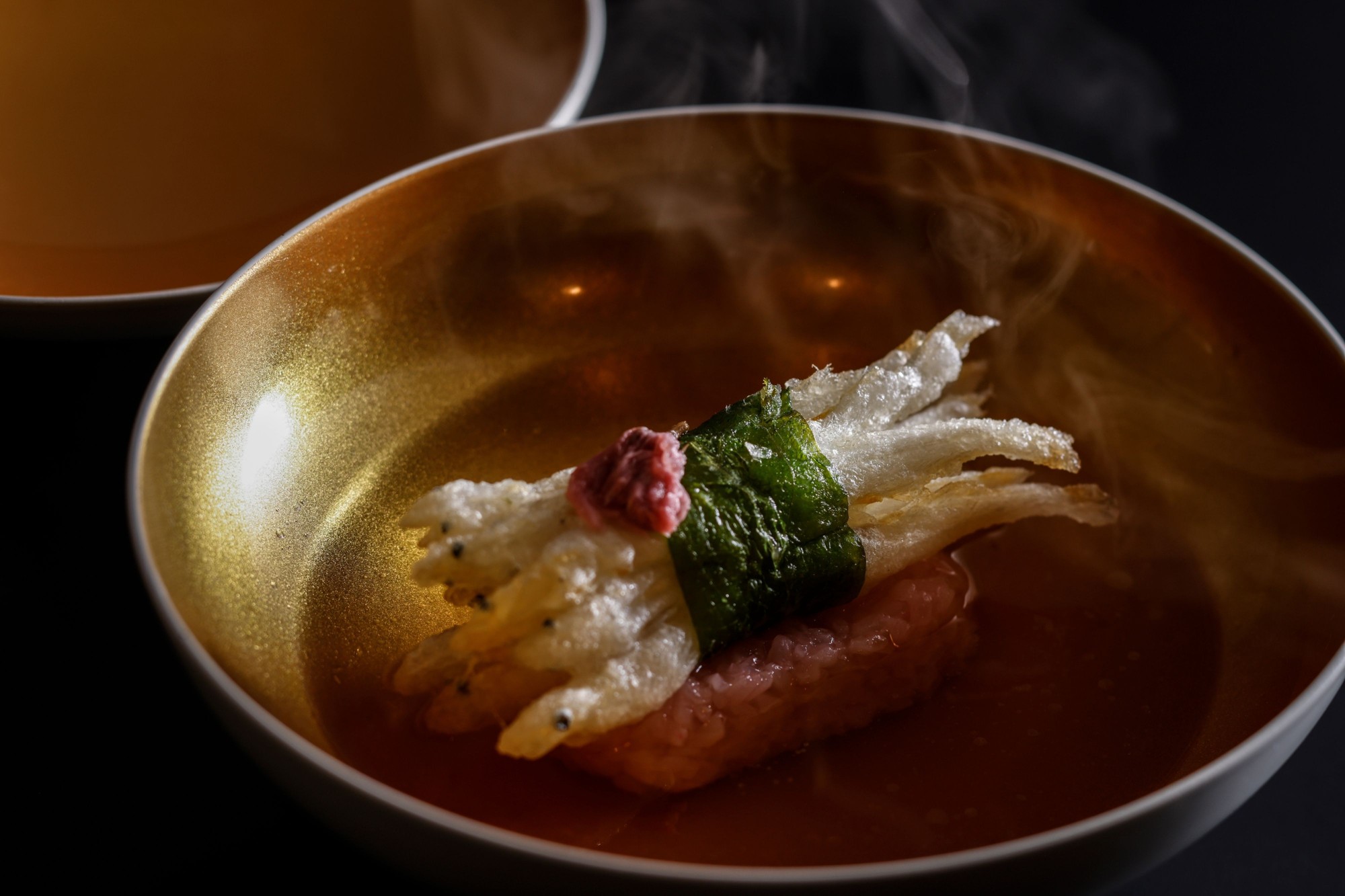 椀の中に描かれた、春の情景。金色の出汁に映える、香り豊かな桜蒸し。