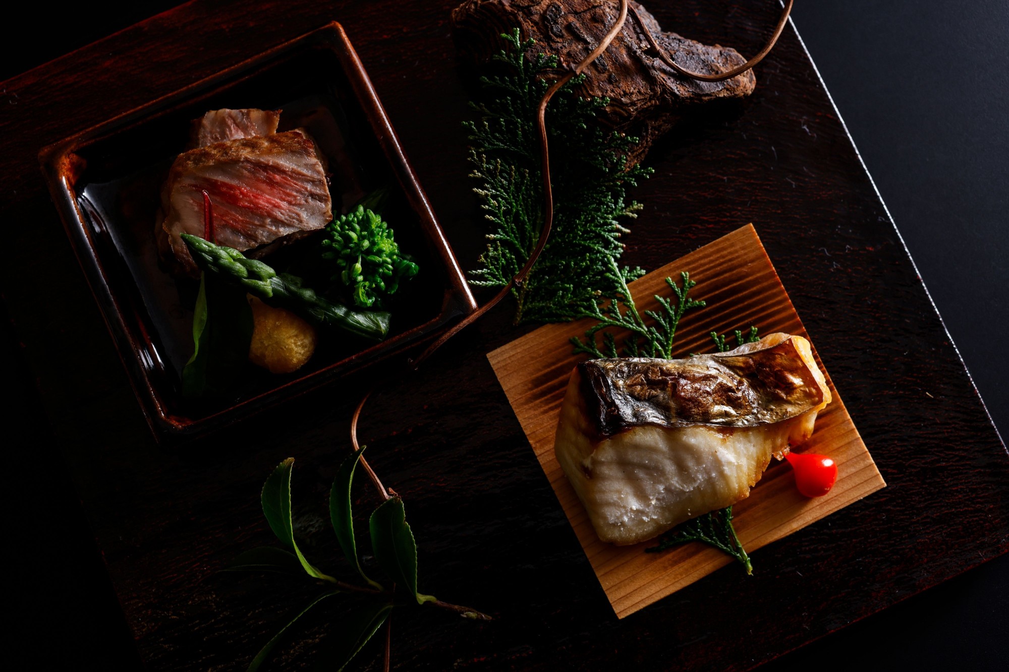【春の献立一例】春の息吹を味わう一皿。旨味あふれる黒毛和牛と、ふっくらと火を入れた地魚の焼き物。