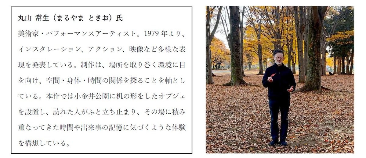 本展参加アーティスト・丸山常生氏が、公園の風景と向き合いながら、その場その時に生まれる出来事をささやかな動きとして紡ぐパフォーマンスを行います。