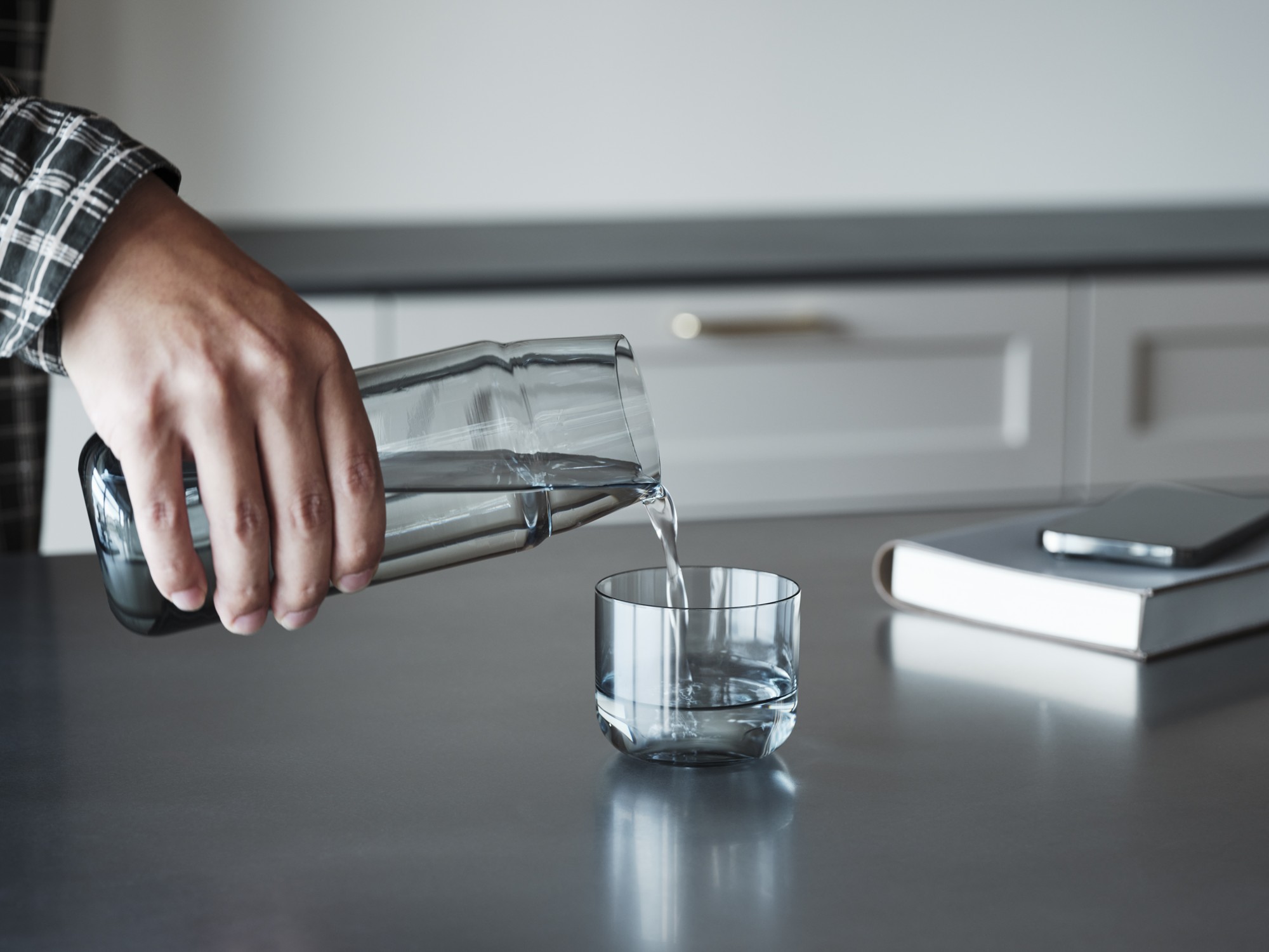 すっきりとした円筒形のフォルムは、テーブルに置くだけで空間を洗練された印象に。注ぎやすさを考慮した口部の形状は、液だれしにくく、日常使いに最適です。