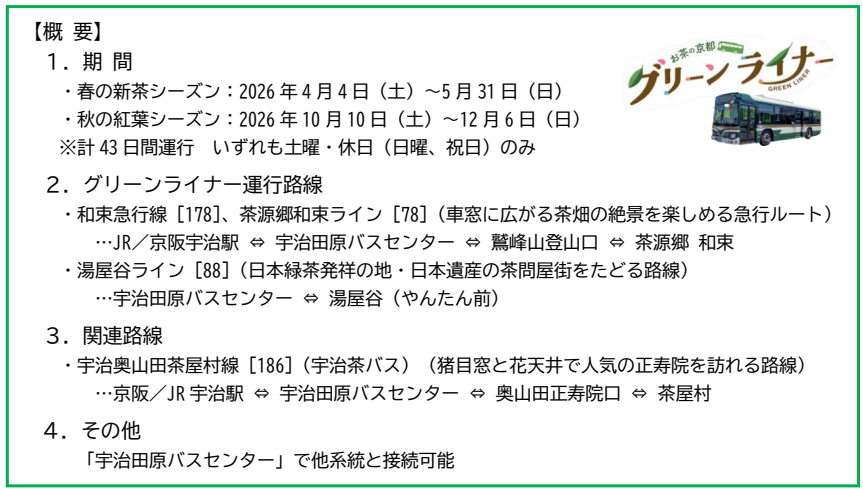 京都京阪バス株式会社(本社:京都府八幡市上奈良、取締役社長:綱手正志)および一般社団法人京都山城地域振興社(通称:お茶の京都DMO、本社:京都府宇治市宇治乙方7-13、代表理事:淺井栄一)は、宇治市・宇治田原町・和束町・龍谷大学との産学官連携のもと、観光路線バス「お茶の京都グリーンライナー」(以下「グリーンライナー」)を運行いたします。