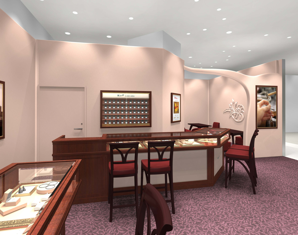 店舗デザインは“幸せのジュエリーを作る妖精が棲むお店”というケイウノのコンセプトを継承。“夢のある空間でジュエリー選びをお楽しみいただきたい”という想いから、アール・ヌーヴォーを思わせる柔らかな曲線に囲まれた空間が広がるように設計しています。