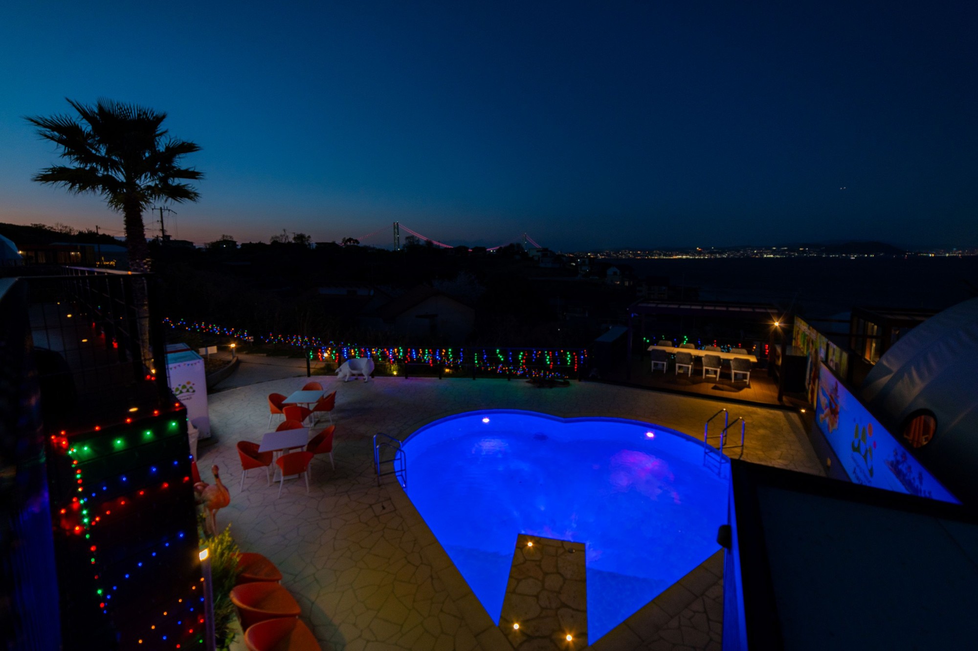日が沈めば、展望台・階段・プール・入口まで丘全体がイルミネーションに包まれ、背後には淡路ICの観覧車がキラキラ光ります。