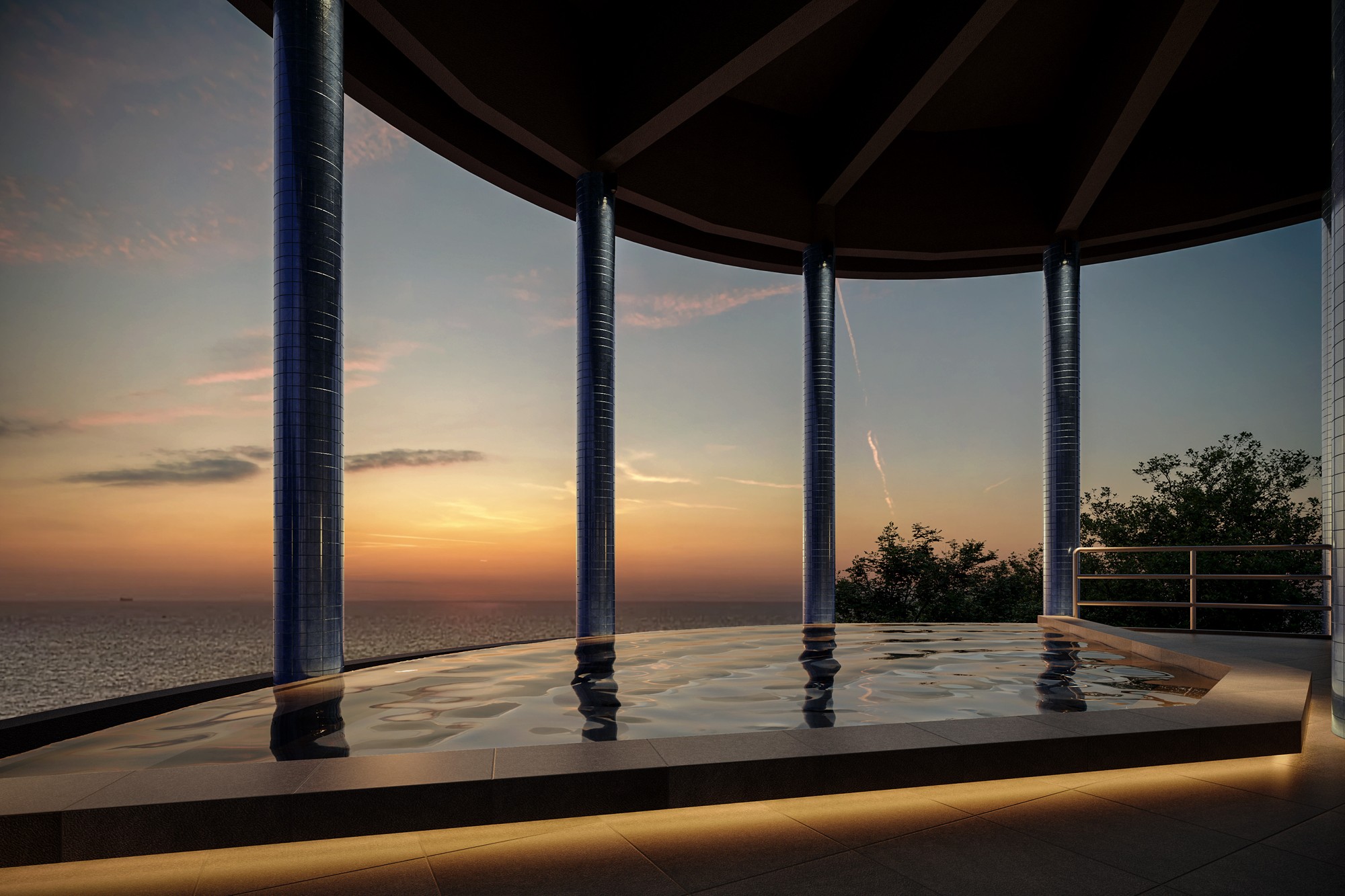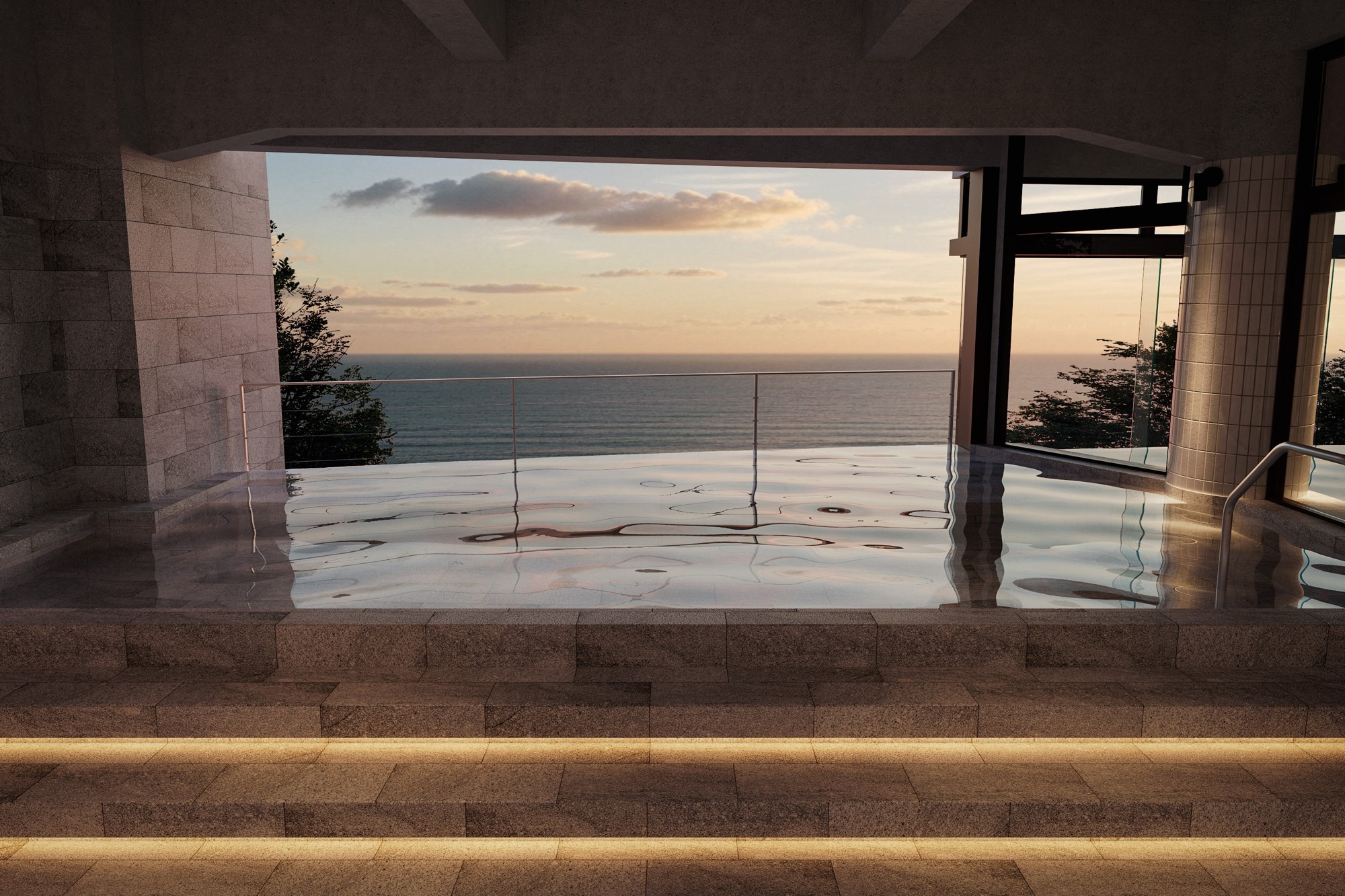 今回のリブランドにおける特徴の一つは、新たに誕生するインフィニティ露天風呂です。眼下に広がるのは、遮るもののない雄大な相模灘の絶景。湯船に浸かると、お湯と海が境目なくとけ合い、圧倒的な没入感を味わえます。
