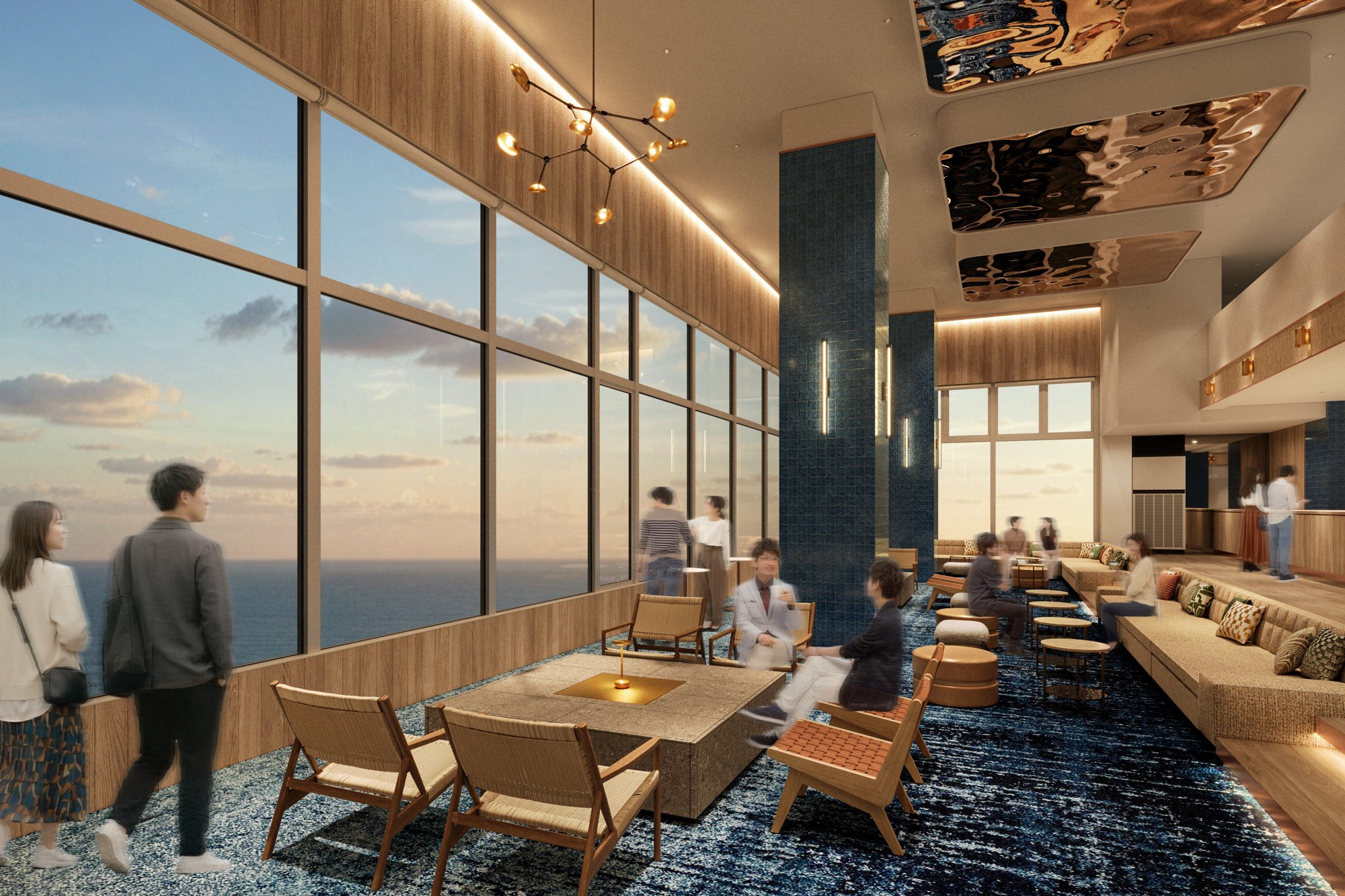 新設されたラウンジは、木の温もりを感じるナチュラルさを基調としながら、随所にシティライクなエッセンスを散りばめた、リゾート空間。ゆらめく火が心を落ち着かせる暖炉を配し、昼夜を問わず上質なひと時を演出します。
