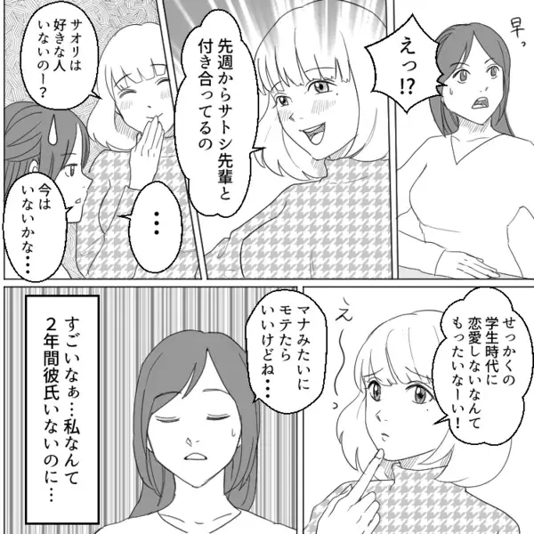 ある日、サオリが校内を歩いていると「マナが人の彼氏を略奪した」という噂を偶然耳にしてしまう。