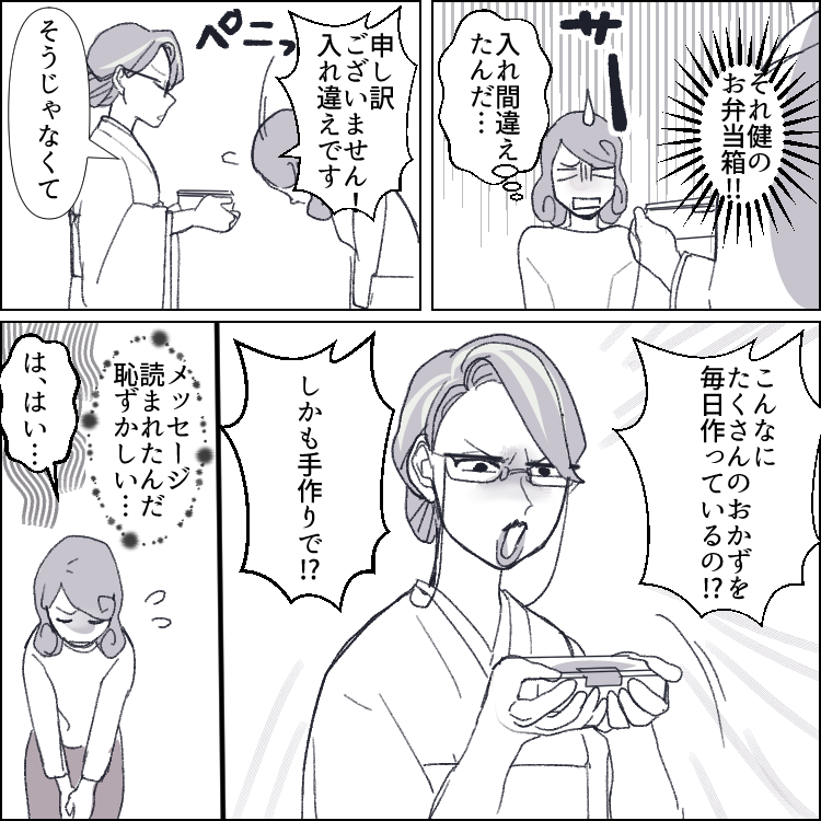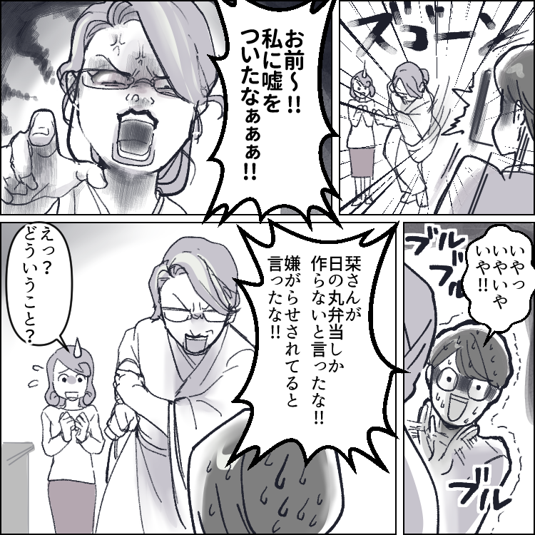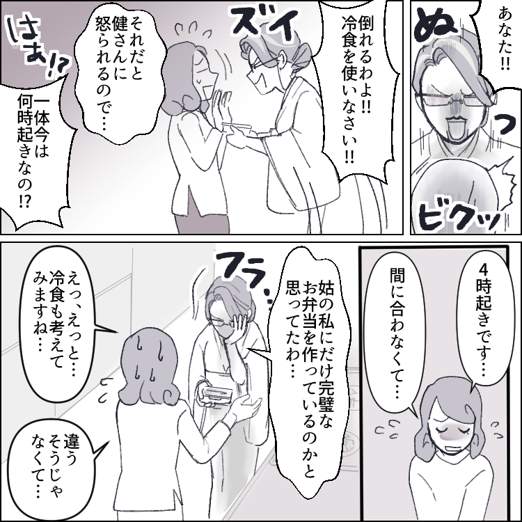 1児の母の栞は、家事・育児・仕事で朝から晩までバタバタの日々を送っている。さらには、義両親と同居しているため、家の中でも気が休まらないでいた。特に姑の美知子はきっちりとした性格で、何かと厳しいことを言ってくることもあった。そんなある日の夜、夫の健がお弁当のことで栞に文句を言ってくる。どうやら冷凍食品のおかずを入れたことがよっぽど気に食わなかったようで、その日以来夫からは無視されるように。どうにか仲直りしたいと考える栞だったが、なんと姑にまでお弁当についてクレームを言われる事態に!?