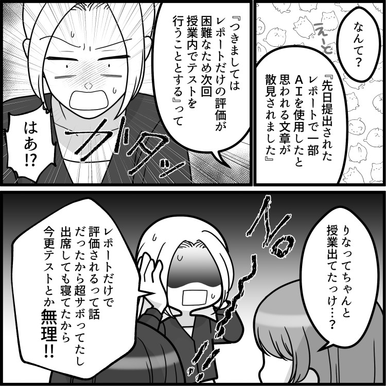 AIツールをフル活用して、いつも大学のレポートを作成しているりな。大学ではAIを課題に使用することは禁止されているため、周りの友達は使っていなかったが、楽をしたいりなはどのレポートにもAIを使用していた。さらには、自力で作成している周りを、要領が悪いと非難する始末。しかし、AI頼りのりなに突然天罰が下ることに!?