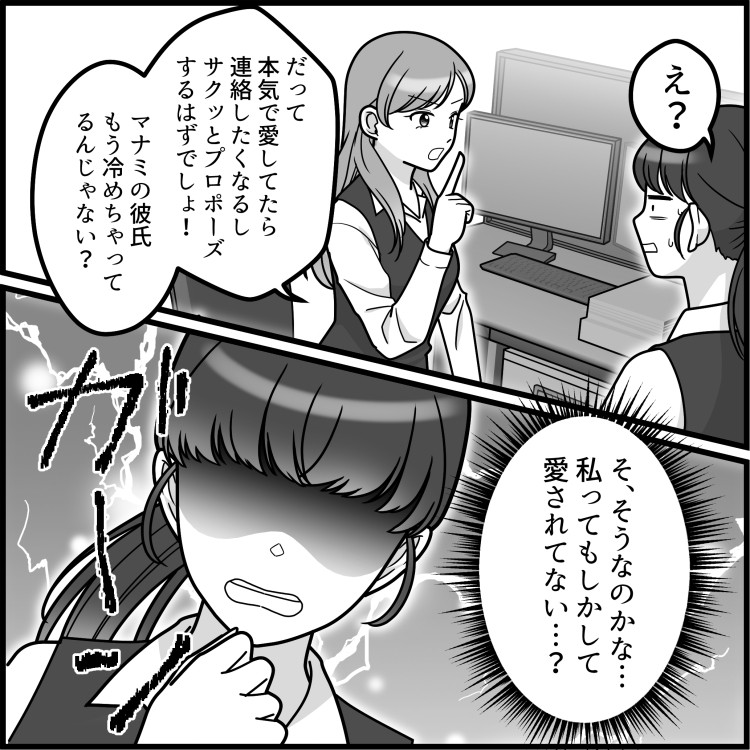 マナミの同僚・リサは彼氏ができたばかり。久しぶりに恋人ができたことがよっぽどうれしいらしく、毎日のように彼氏の自慢をマナミにしてくるリサ。そんなある日、リサに彼氏のことについて聞かれて、何気なく答えるマナミ。すると、なんといきなりリサにマウントを取られる事態に!?