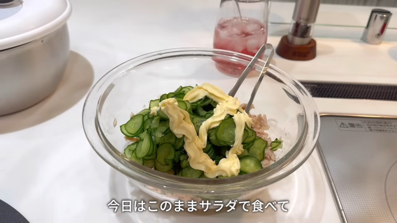 出典:aya vlogスライスしたきゅうり3本分を塩もみし水気を切ったあと、ツナ缶2缶・酢・塩・ブラックペッパー・マヨネーズを加えて和えれば、あっという間に絶品サラダの完成。サンドイッチの具材にリメイクもできますよ。