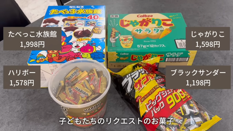 出典:aya vlog「たべっ子水族館」や「じゃがりこ」などのお菓子も、コストコならではの巨大パックで登場。