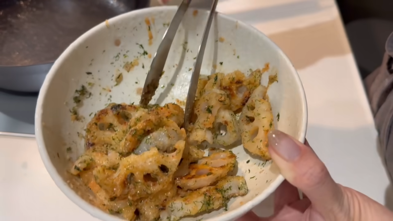 出典:aya vlog片栗粉をまぶしたれんこんをフライパンで焼き、塩、青のりと辛子明太ばらこを和えれば、「れんこんののり塩明太」の完成!ごはんが進むこと間違いない一品です。