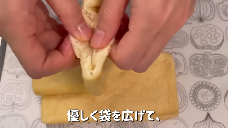 油揚げはキッチンペーパーでしっかり油抜きをすると開きやすく破れにくくなります。