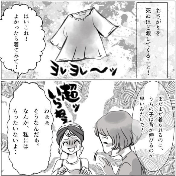 同じ幼稚園に通っているママ友のことで悩みを抱えている主人公。ママ友は何かとおさがりを譲ってくれるものの、大体は汚れていたり、破れていたりするもので、もはやゴミ同然とも思えるものもあった。周りのママ友たちもありがた迷惑だと思っているものの、みんな本人には強く言えないでいた。そんなある日、ママ友からいきなりラッピングされたプレゼントを渡される主人公。恐る恐る中身を確認すると、なんとそこには想像を超える代物が入っていた!?