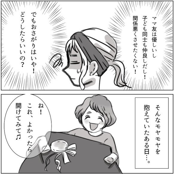 中身を確認して硬直する主人公!この後、ママ友のトンデモ行動に子どもたちが大号泣!?