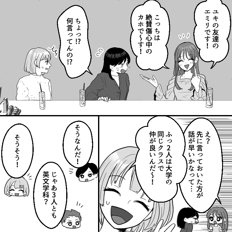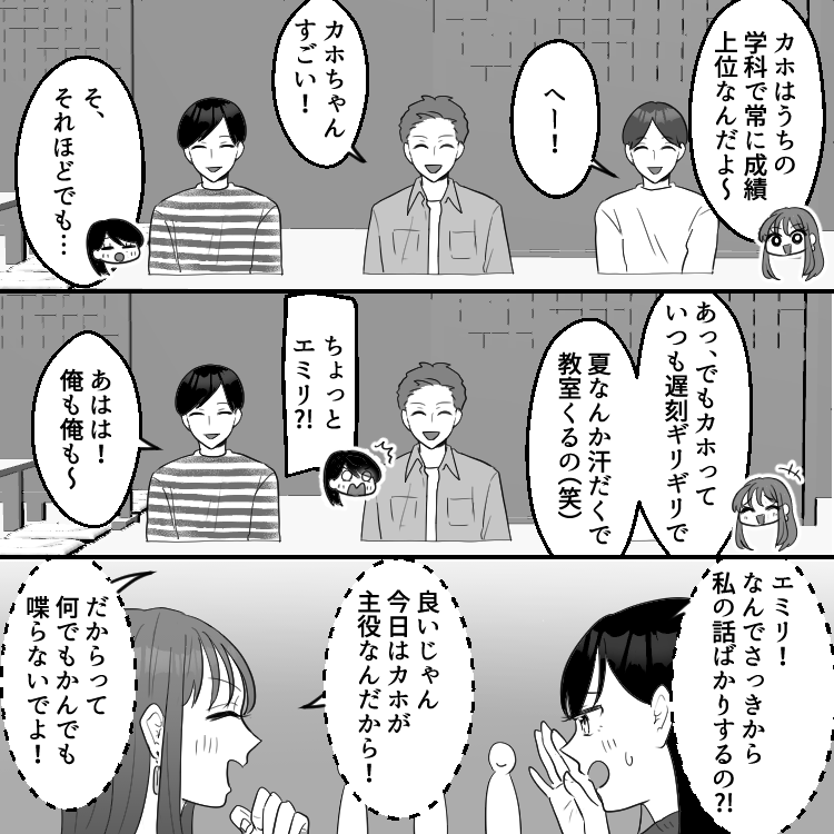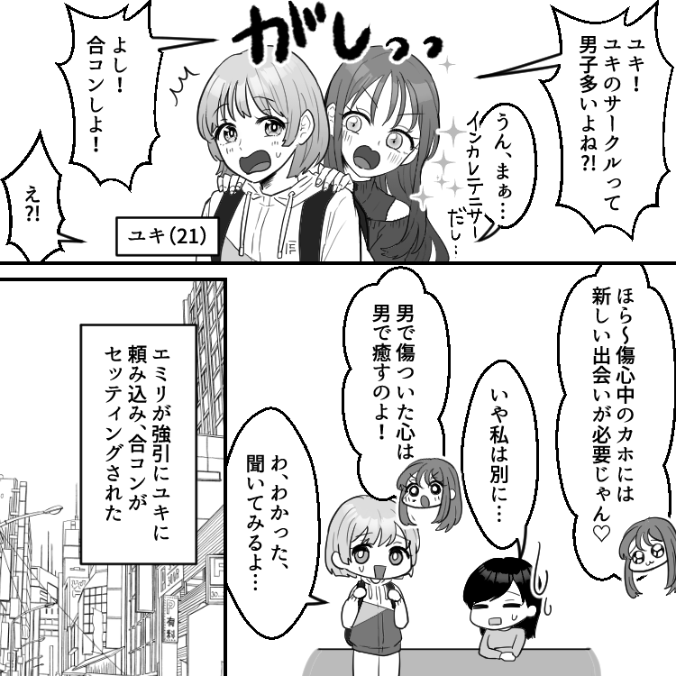 カホは元彼の3股が原因で破局したばかり。あまりのショックでまだ立ち直れておらず、大学でも毎日ブルーな気分になっていた。友達のエミリはそんなカホの様子が気になるようで、カホを励ますために無理やり合コンをセッティングする。しかし、この合コンでデリカシーのないエミリが余計なことをしてしまうことに!?