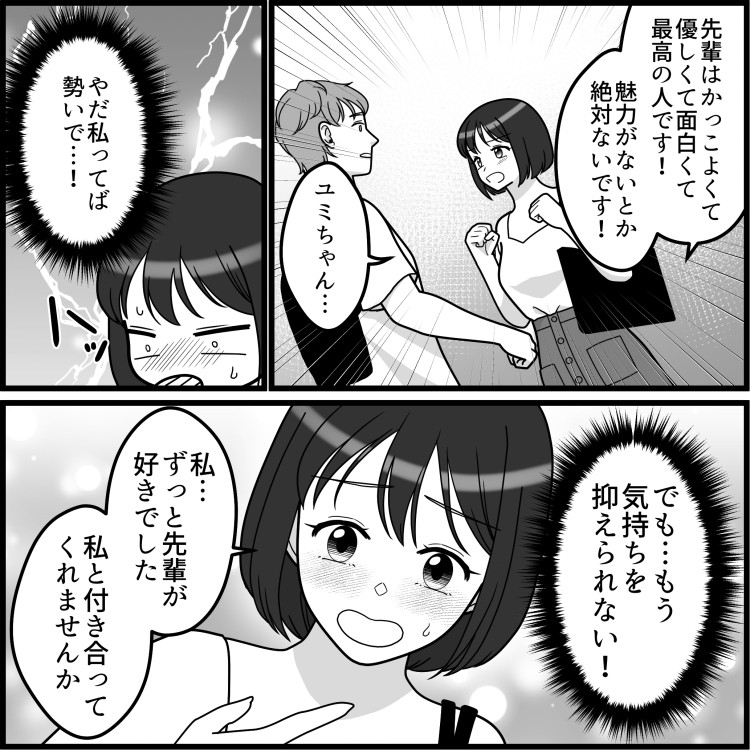 サークルの先輩・ケイタに片想いしているユミ。しかし、先輩にはサークル1の爆美女・レイカさんという彼女がいるため、想いは伝えないでいた。そんなある日、レイカさんの浮気がきっかけで、先輩たちが別れたことを知る。ケイタ先輩にそのことを聞かされ、勢いでユミが告白すると、なんとOKをもらえて晴れて恋人同士に。これからラブラブな日々が始まると思いきや、なんと元カノ・レイカさんが邪魔してくる事態に!?