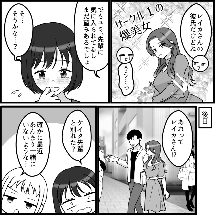 サークルの先輩・ケイタに片想いしているユミ。しかし、先輩にはサークル1の爆美女・レイカさんという彼女がいるため、想いは伝えないでいた。