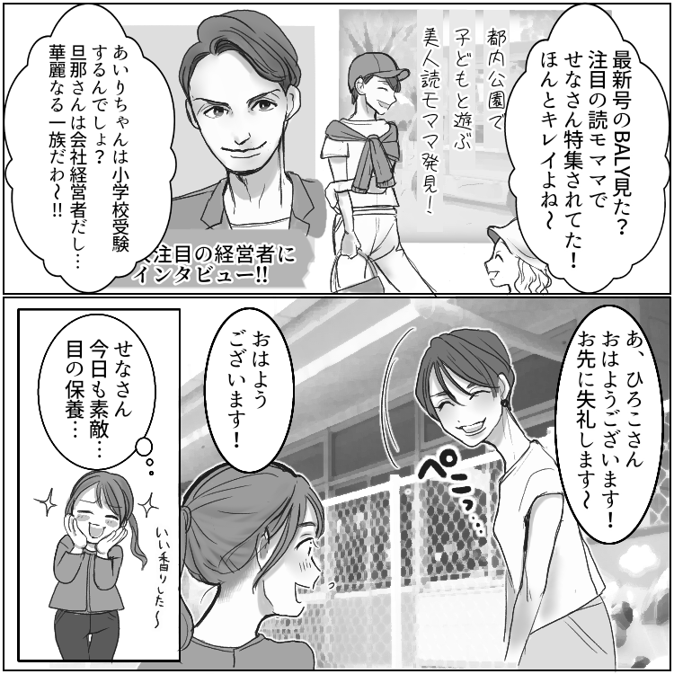 せなさんはひろこと同じ幼稚園に通う美人ママ。読モとしてよく雑誌に載っており、毎日おしゃれもメイクも完璧なため、園ママ達はせなさんに憧れていた。さらに、ご主人はイケメン経営者、娘のあいりちゃんは頭脳明晰で小学校受験を目指しており、華麗なるファミリーとして周りから注目されていた。
