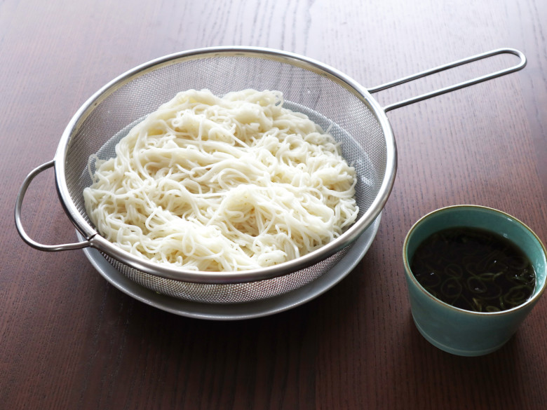 16メッシュの細かな網を使用したざるなので、素麺も穴から抜け落ちず、フライパン茹でするのに便利です。茹で、湯切りはもちろん、流水でぬめりをとるようにもみ洗う際には、長めの取手で片手が水に濡れずにすみます。ちゃっちゃと水切りし、テーブルでの水切り置きなどジャストフィット!!料理シーンの細かい動線がスムーズになり、調理全体のタイパに繋がります。