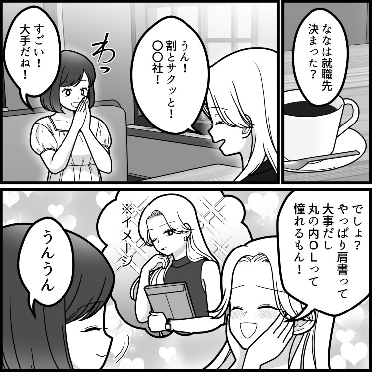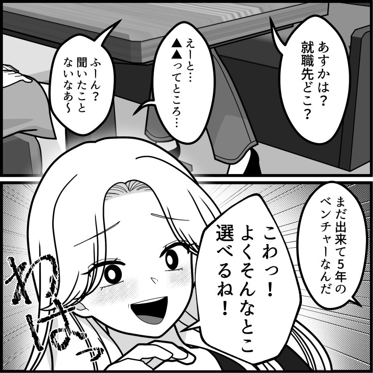 大学4年生のあすかは大学で久しぶりに同級生・ななに会い、ランチをすることに。就職先の話になり、ななは大手企業に内定していることを自慢気に話す。あすかは設立5年のベンチャー企業に内定が決まったことを話すが、なんと途端にななの態度が変わり、明らかにバカにしてくる事態に!?