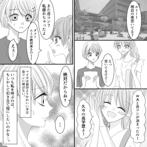 大学生のマイカは、高学歴のイケメン彼氏が欲しいようで、日々合コンを渡り歩いている。彼女から頻繁に合コンに誘われるエミは、正直そこまで参加したいと思っていなかったが、毎回マイカにしつこくお願いされ、半ば強引に参加させられている状態だった。