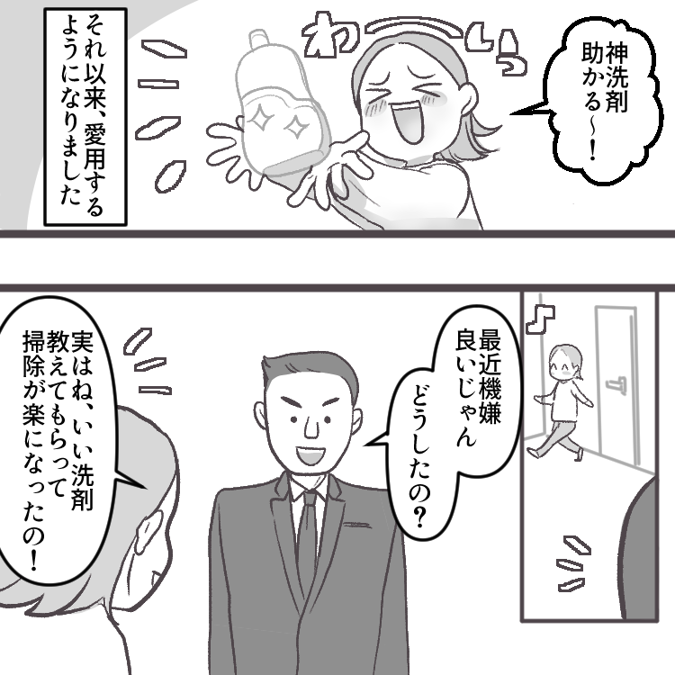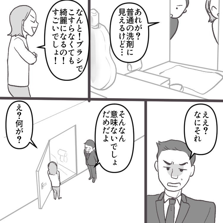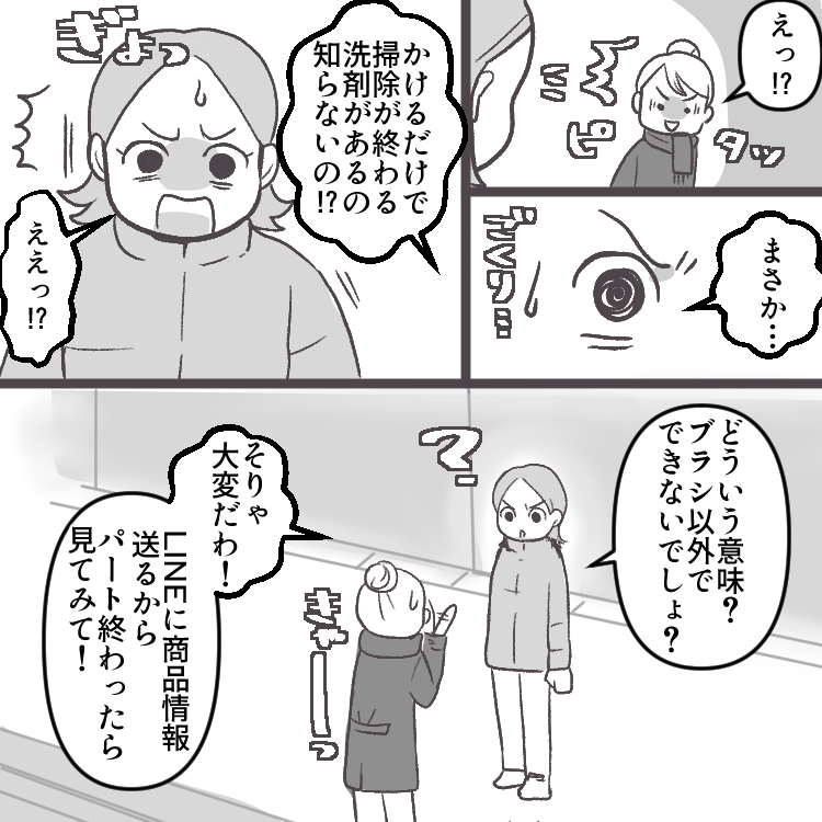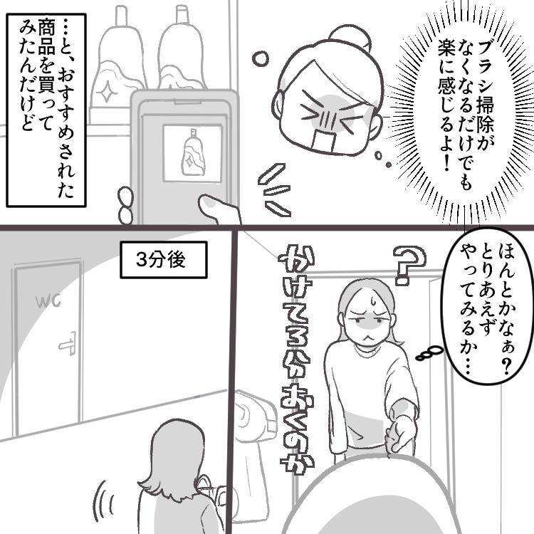 明菜は2人の息子を育てるママ。夫は帰りが遅いことが多く、いても何もしてくれないため、わんぱく盛りな子どもたちの世話に加えて家事もほぼ全て明菜が担当している状況だ。そんなある日、ママ友の遼子さんとトイレ掃除について話していると、彼女からとある洗剤をオススメされる。ブラシでこする必要がなくなると聞いて早速使ってみると、その効果ぶりに驚く明菜。それからはブラシを使わずにトイレ掃除をしていたが、その事実を知った夫からなんと衝撃の一言が!?