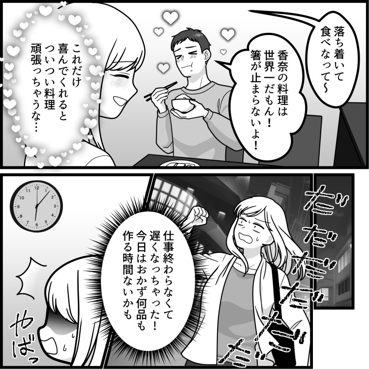 賢人と結婚して1カ月が経過した香奈。ここ1カ月は新婚だからと料理に力を入れていて、毎日まるで旅館のような品数を出していた。しかし、張り切りすぎて疲れてしまったため、同僚からたまには丼ものや麺類、お惣菜も取り入れるべきだとアドバイスを受ける。後日、仕事がなかなか終わらず帰宅するのが遅くなってしまった香奈は、結婚後はじめて丼ものメニューにしてみることに。しかし、親子丼を見た賢人の反応は予想外のものだった!?