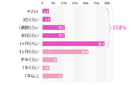 「“恋の予感”から交際が始まるまでの期間は?」という質問に対し、約6割が“恋の予感”から1か月以内という短い期間で恋愛を成就させていることも明らかになった。