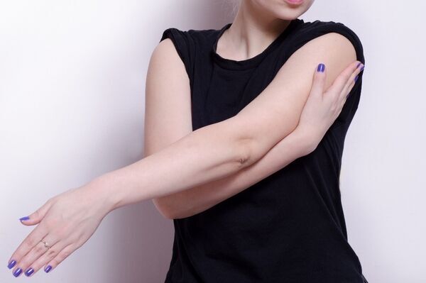 簡単なエクササイズ法です。1手の平を上にし、右腕を真っ直ぐ前に伸ばします。2左手で指先を持ちます。3息を吸いながら、指先を下に下げます。4吐きながら、ゆっくりと指先を元の場所に戻します。