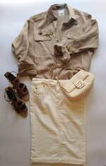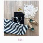 ベージュ×ホワイトコーデは、引き締め小物を取り入れて