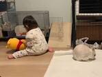 部屋を散歩中のウサギ 『背後の出来事』に「笑った」「いたずらな天使」