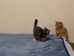 『やんのかステップ』で、ケンカを売る子猫 対する、先輩猫の反応は…?