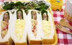 春眠暁を覚えず。ウインナーに顔を付けたらサンドイッチが寝袋みたいで可愛い