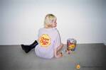 X-girl「チュッパチャプス」のロゴ入りカラフルTシャツ、吹き出し風グラフィック付き