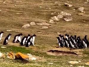 ペンギンの群れが鉢合わせ すると混乱した1羽が? 「笑った」「うっかりさんがいる」