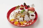 パンケーキ専門店バター“クリスマスツリー”のようなパンケーキタワー、苺の雪だるまを飾って
