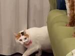 ベッドの上を見ながら慎重に歩く猫 そこにいたのは?
