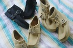 ニードルズ×クラークス オリジナルズ「ワラビー」シューズ、“ピースマーク”バックルのスエードブーツ