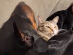 ドーベルマンに顔を舐められた猫 見せた『表情』に「めちゃくちゃ笑った」